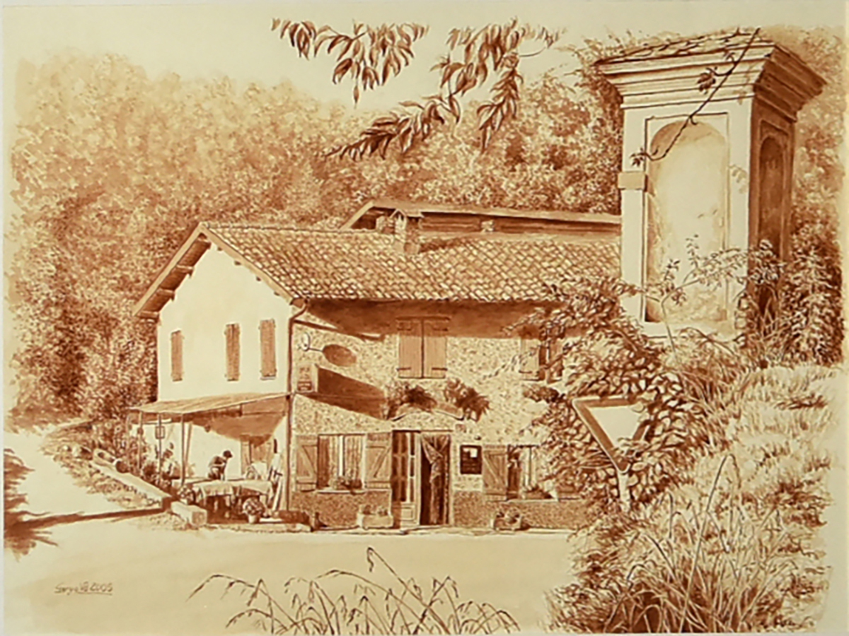 Antica trattoria e pilone votivo - acquerello monocromatico