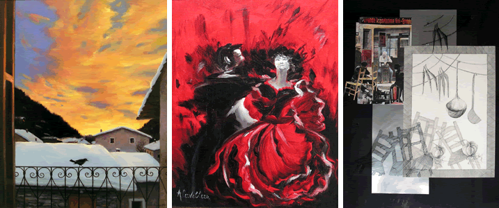 Disegno, Pittura ad olio, Acquerello, Acrilico, Sbalzo su metallo, Incisione.